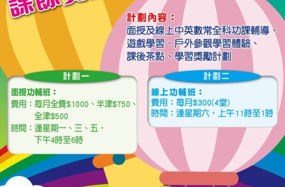 內 容:面授及線上中英數常全科功課輔導、遊戲學習、課後茶點、戶外參觀